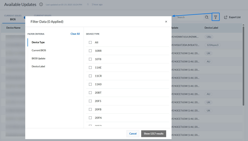 Die Seiten der Berichte über LDO-Geräte-Insights enthalten auch eine Filteroption, mit der Benutzer ihre Suche eingrenzen und verfügbare Aktualisierungen mit Kriterien wie Gerätetyp, Aktuelles BIOS, BIOS-Aktualisierung oder Gerätetikett leichter finden können.
