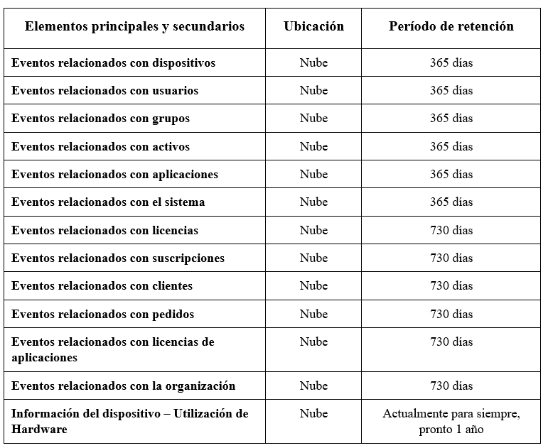 Tenga en cuenta que datos de carácter personal quiere decir toda información que esté relacionada con una persona natural identificada o identificable. Cuando usa el producto, el cliente de extremo de Lenovo Device Orchestration recopila los datos y los resume en el suscriptor cliente dedicado alojado en uno de nuestros centros de datos de AWS o Azure. Lenovo no accede ni procesa dichos datos, a menos que preste servicios de asistencia al cliente. Las categorías de datos se pueden resumir en: a) datos de estado, condición o rendimiento de los dispositivos que use o administre; b) datos de uso de software; c) datos de ubicación no precisos y d) inventario de dispositivos. Consulte la siguiente tabla para obtener información más detallada.