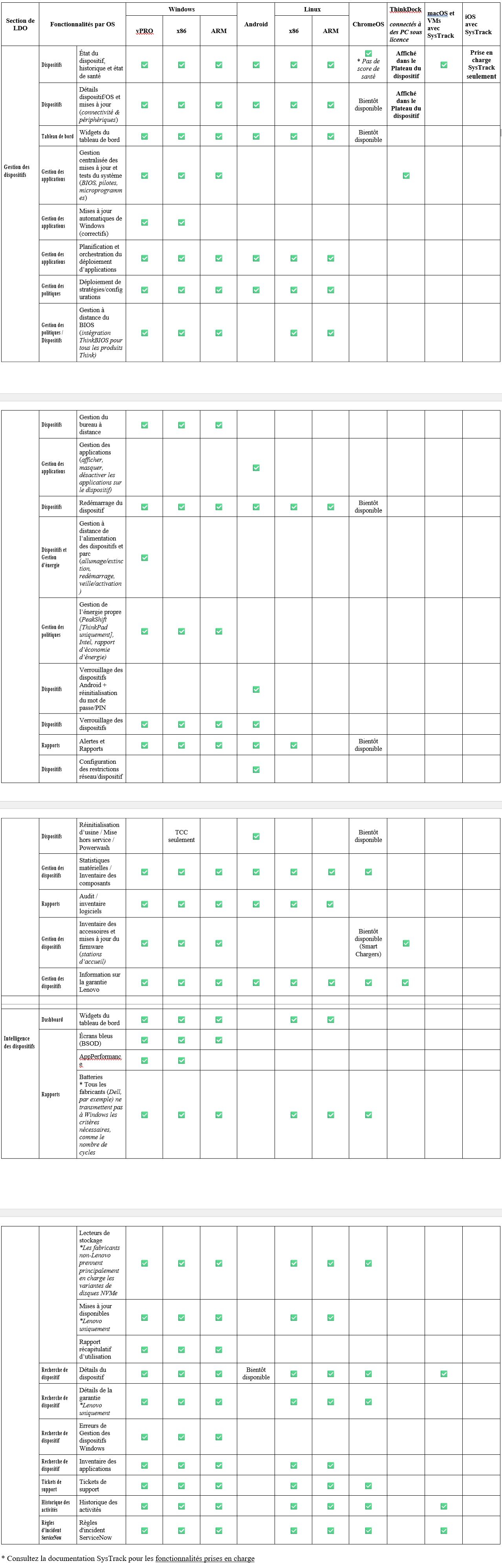 Cette matrice fournit une vue d’ensemble des systèmes d’exploitation et des environnements pris en charge par Lenovo Device Orchestration pour ses principales fonctionnalités de gestion. Elle présente clairement la disponibilité des fonctions — telles que le contrôle d’alimentation à distance, le déploiement d’applications et la gestion du BIOS — sur les différentes plateformes, notamment Windows, Android, Linux, ChromeOS, macOS et iOS, et indique également la prise en charge du matériel spécialisé, comme les ThinkDocks.