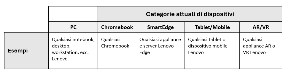 I dispositivi rappresentano i vari tipi di dispositivi presenti nell'organizzazione e tipicamente utilizzati dai dipendenti. Un tipo di dispositivo può rientrare in una delle seguenti categorie: