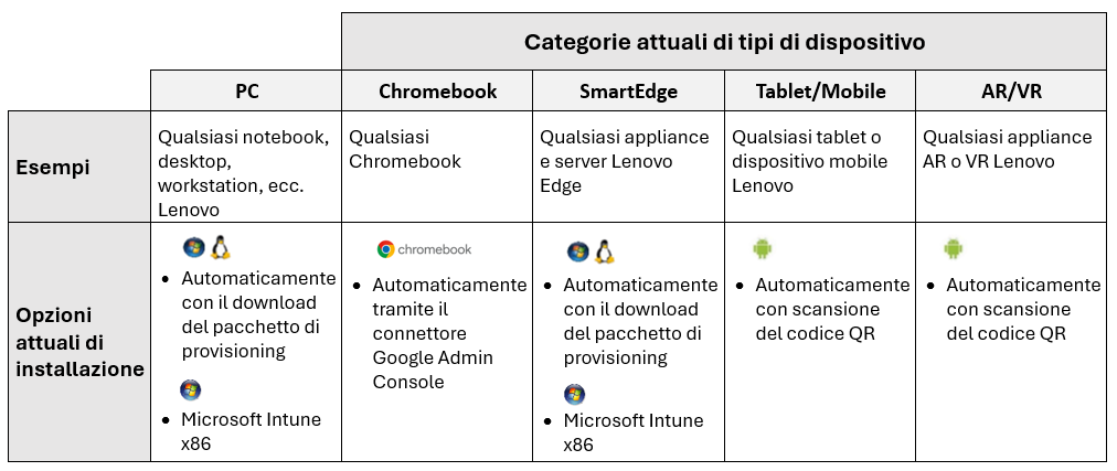 Per i passaggi dettagliati relativi all'aggiunta di dispositivi Windows, Linux, Android e Chrome a Gestione dispositivi, consultare la documentazione riportata nei link sottostanti.