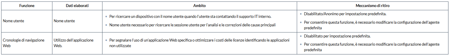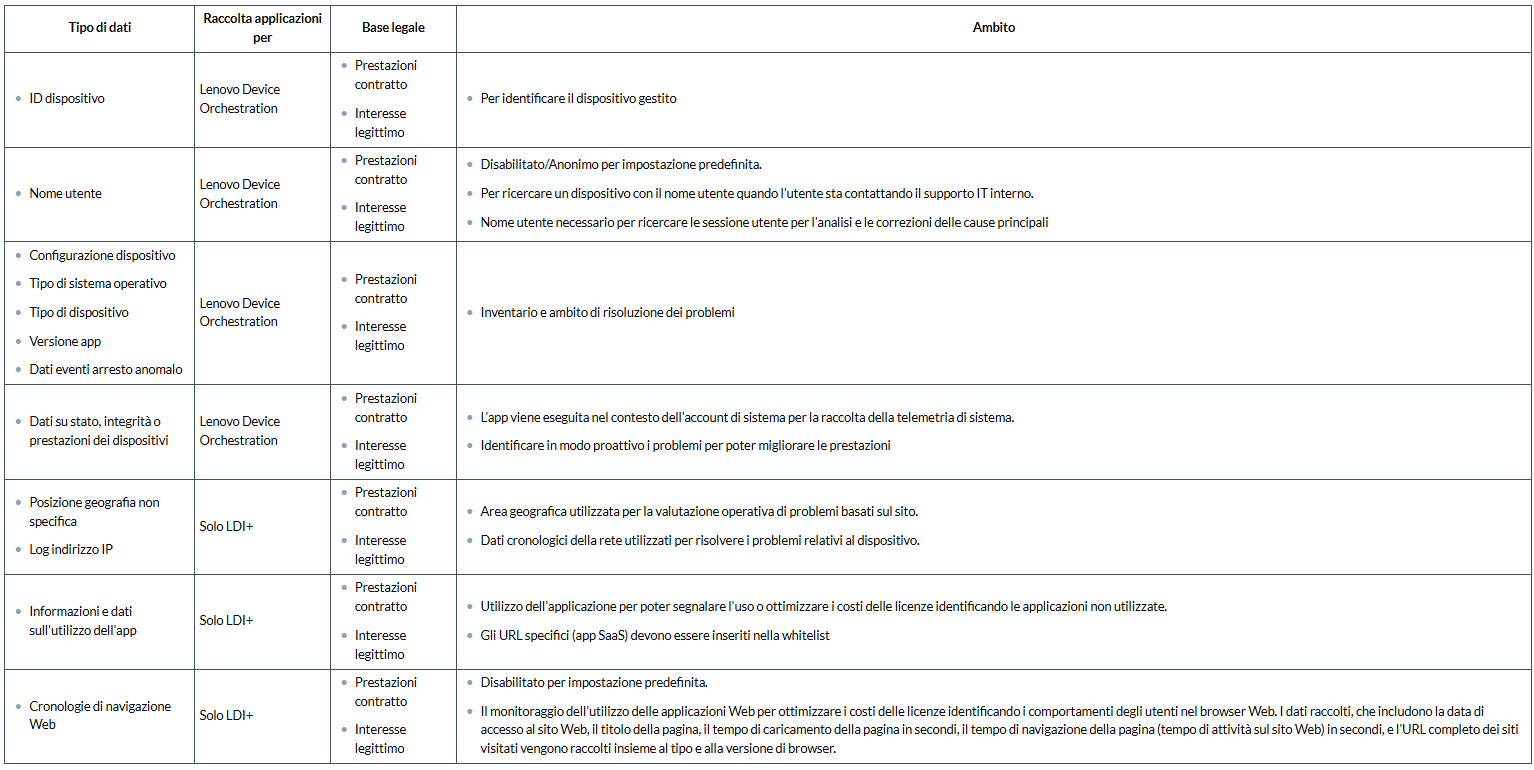 Dati personali indica qualsiasi informazione correlata a una persona fisica identificata o identificabile. Quando l'utente utilizza il prodotto, i dati vengono raccolti dal client endpoint Lenovo Device Orchestration e riepilogati nel tenant del cliente dedicato ospitato su uno dei data center AWS e/o Azure di Lenovo. Lenovo non accede a tali dati né li tratta se non per fornire servizi di assistenza ai clienti. Le categorie di dati possono essere riepilogate in: a) dati sullo stato, l'integrità o le prestazioni dei dispositivi usati o gestiti dall'utente, b) dati sull'utilizzo del software, c) dati sulla posizione non precisi e d) inventario dei dispositivi. Per informazioni più dettagliate, l'utente potrà prendere visione della tabella che segue.