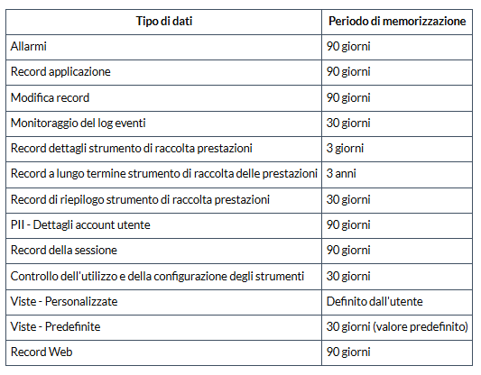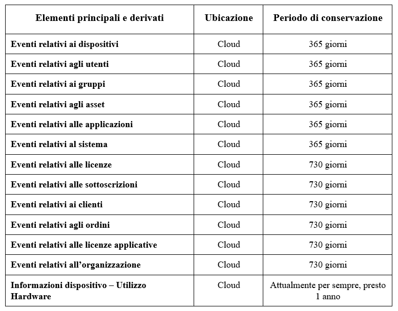 Di seguito sono riportate informazioni dettagliate sul programma di conservazione dei dati nell'ambito di Lenovo Device Orchestration. La conservazione dei dati inizierà nel momento in cui l'evento verrà registrato sul dispositivo e continuerà per il periodo specificato.