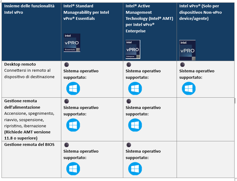 - Funzionalità Intel vPro® che richiedono solo l'agente Intel vPro® (Funzionalità in-band – non richiede chipset):