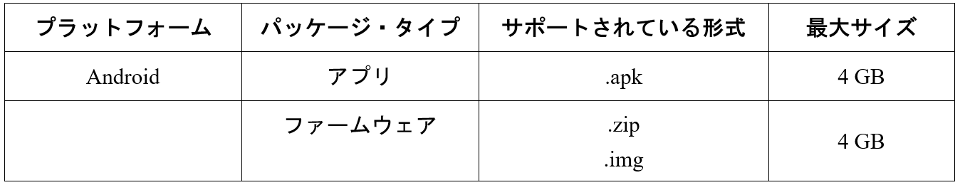 - ドロップダウンから、対応する「パッケージ・タイプ」を選択します。Android は、「アプリ」と「ファームウェア」の両方のパッケージ・タイプをサポートしています。