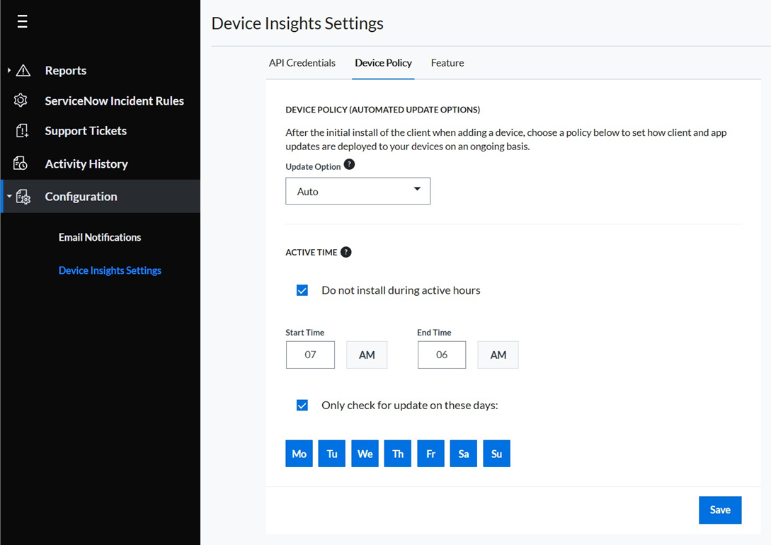 - 「アクティブの時間帯にはインストールしない」を有効にすると、LDO ユーザーはアクティブの時間帯を定義できます。この期間中、UDC エージェントは更新の実行を控えます。