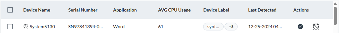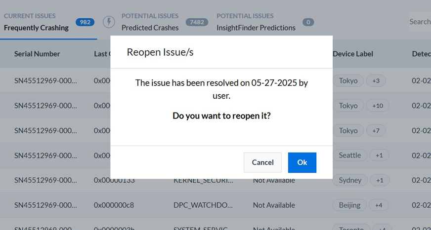 デバイスの問題を解決済みとしてマークできるようになりました。デバイス名の前に緑色のチェックマーク・アイコン が表示されます。アイコンにカーソルを合わせると、メッセージ・ボックスがポップアップ表示されます。リスト内で行がグレー表示されます。