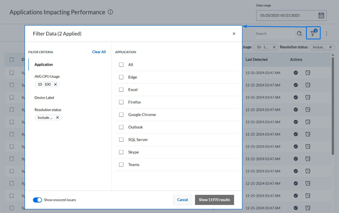 デバイス・インサイト・レポートにはフィルタリング・オプションが含まれており、ユーザーはアプリケーション、平均 CPU 使用率、デバイス・ラベル、パフォーマンスの問題の解決ステータスなどの条件でアプリのパフォーマンスの問題を絞り込むことができます。
