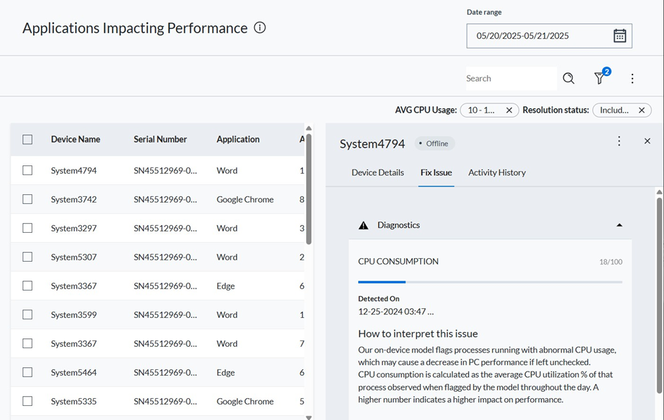 LDO デバイス・インサイトは、オンデバイス AI を使用して、パフォーマンスを低下させたり、フリート全体の問題を通知したりする可能性のある異常なリソース使用を検出します。コアあたりの CPU 負荷が高い原因となっているアプリやプロセスにフラグを立てます。このレポートは、IT 管理者がスヌーズ、エクスポート、全フリートのフィルタリングなどの機能を使用して、デバイス・パフォーマンスの問題を診断、追跡、および解決するのに役立ちます。