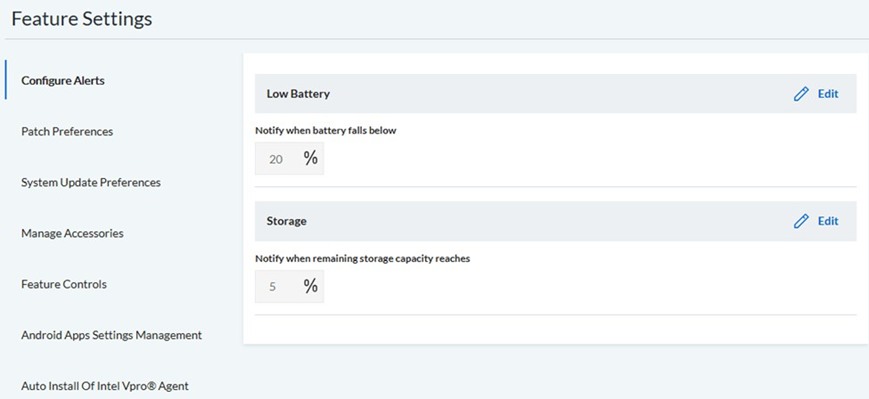 バッテリー残量とストレージ容量が少ない場合のアラートしきい値の設定を有効にします。デバイスがこれらのしきい値に達すると、対応するレポート (低バッテリー・レポートまたはストレージ・レポート) にアラートが生成されます。ユーザーがファイルを削除してストレージ容量を増やしたり、バッテリーを充電したりするなどの操作を行うと、アラートはレポートから削除されます。