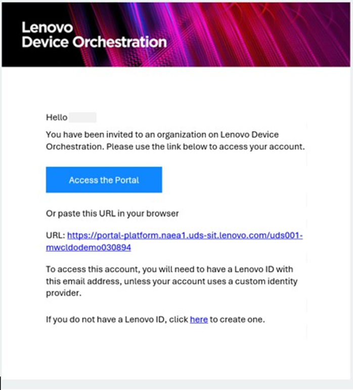 組織のポータルが作成されると、単一の管理アカウントが作成されます。販売時に Lenovo に指定された IT オーナー (組織管理者) には、お客様の組織へのアクセスが許可されたことを示す Lenovo Device Orchestration (LDO) のメールが届きます。リンクをクリックすると、サインオン・ページが開き、組織管理者として LDO にログインできます。この管理者アカウントを使用すると、組織管理者はポータルの構成、ユーザーの招待、デバイスの追加を行うことができます。