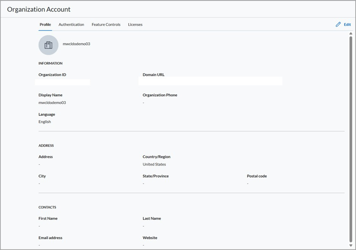 このタブには組織アカウントのプロファイルが表示され、組織管理者と IT 管理者が組織の主要な情報を管理するためのハブとして機能します。