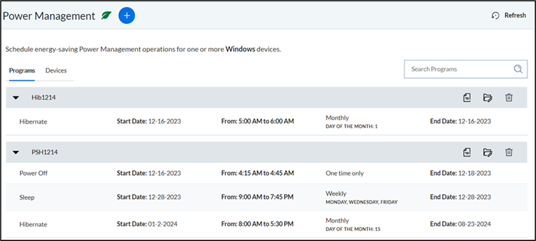 この機能により、複数のスケジュールを持つ複数の電源管理操作を 1 つの使いやすいツールにプログラミングできます。IT 管理者は、組織、デバイスのグループ、または個々のデバイスに対してスケジュールを設定できます。