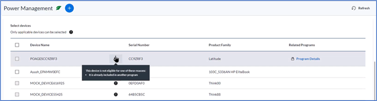 デバイスが対象外となる要因として、次のようなその他の理由があります: デバイスの AMT バージョンが 11.8 未満である、既に別のプログラムに含まれている、削除待ちである、ライセンスがない。デバイスが対象でない場合は、デバイス名の横にツールチップが表示され、その理由が説明されます。