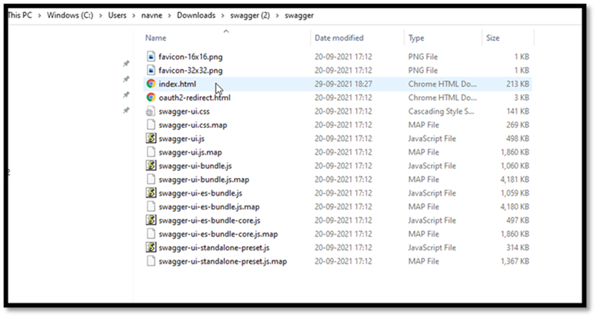Swagger 仕様アーカイブには、index.html ファイルとその他の JavaScript ファイルを含むフォルダーが含まれています。
