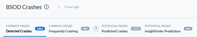 Windows デバイスのシステム・クラッシュは、一般にブルー・スクリーンと呼ばれます。LDO デバイス・インサイトは、人工知能を使用してデバイスのハードウェア、ドライバー、OS イベントを分析し、現在発生している、または将来発生する可能性のあるクラッシュを強調表示します。