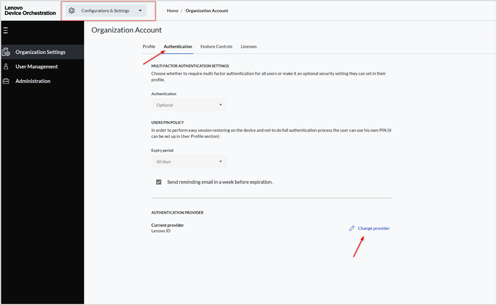 このガイドでは、Lenovo Device Orchestration (LDO) を Microsoft Entra ID に移行する方法について説明します。このプロセスでは、Microsoft Entra で新しいアプリを設定し、必要な構成データを収集して、LDO の認証設定を更新します。この機能は組織管理者のみが利用できることに注意してください。 LDO の組織アカウントにアクセスする LDO ポータルの上部にあるドロップダウン・リストをクリックし、「構成と設定」を選択します。 ...