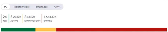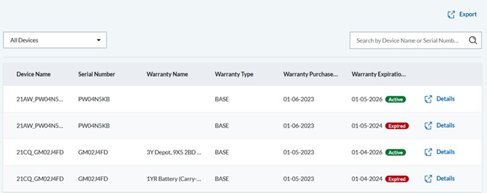 このページの最初のセクションには、デバイスの総数と、各保証ステータスのデバイスの数が表示されます。この下には、詳細な保証情報を含むすべてのデバイスのリストが表示されます。