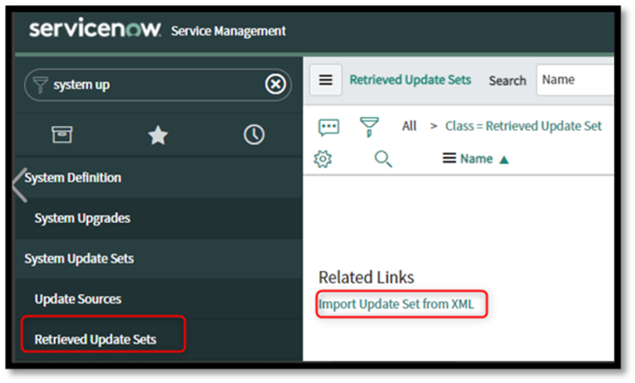 검색된 업데이트 집합을 클릭하십시오. 관련 링크에 XML에서 업데이트 집합 가져오기 링크가 표시됩니다.