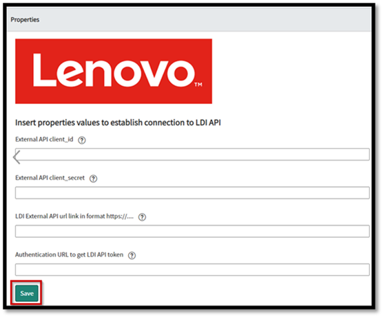 LDI 구성을 클릭하십시오. 속성 페이지가 표시됩니다. 이 페이지에서 LDI API 자격 증명을 입력하여 ServiceNow와 LDI 플랫폼 간의 연결을 설정합니다.