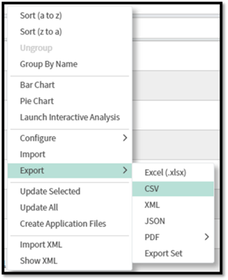 내보내기 탭을 마우스 오른쪽 버튼으로 클릭하십시오. 사이드 메뉴가 나타납니다. 컨텍스트 메뉴에서 내보내기 → CSV를 선택합니다.