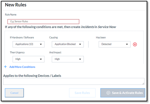 인시던트 규칙을 만들기 전에 LDO에서 ServiceNow를 구성해야 합니다. 자세한 내용은 ServiceNow를 LDO에 통합 페이지에서 참조하십시오.