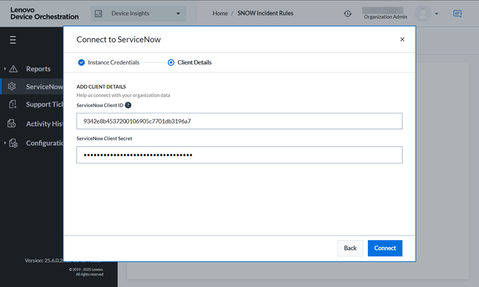 - 클라이언트 상세 정보 섹션에서 ServiceNow 클라이언트 ID 및 ServiceNow 클라이언트 암호를 입력합니다.