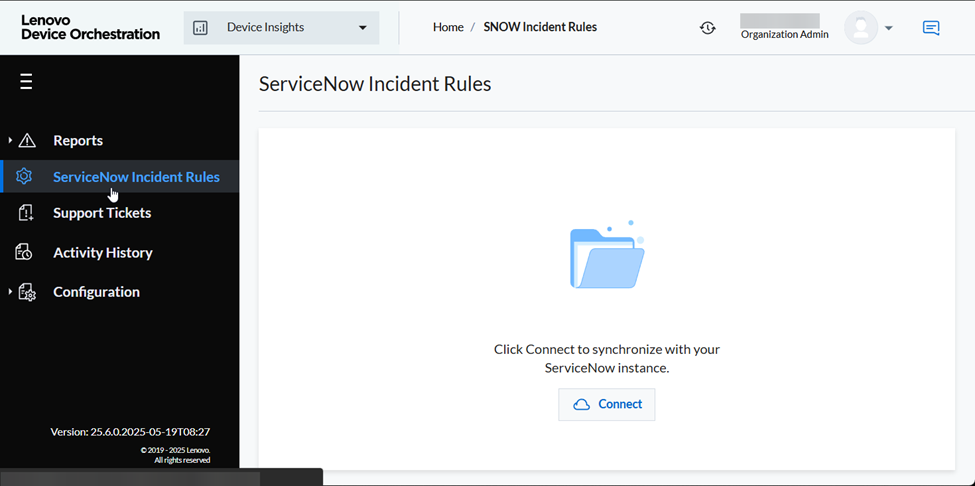 장치 인사이트/ServiceNow 인시던트 규칙을 선택합니다. SNOW 인시던트 규칙 페이지가 나타납니다.