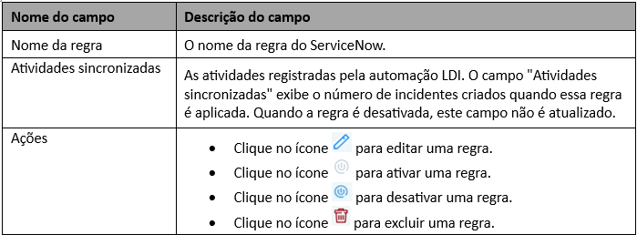 A tabela a seguir exibe os campos na página Regras de incidente do SNOW: