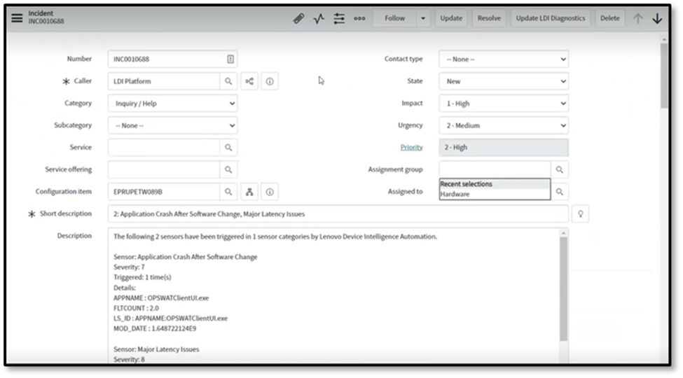 - Clique em LDI. O registro LDI é exibido no aplicativo ServiceNow.