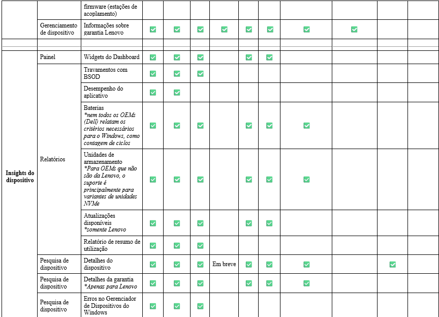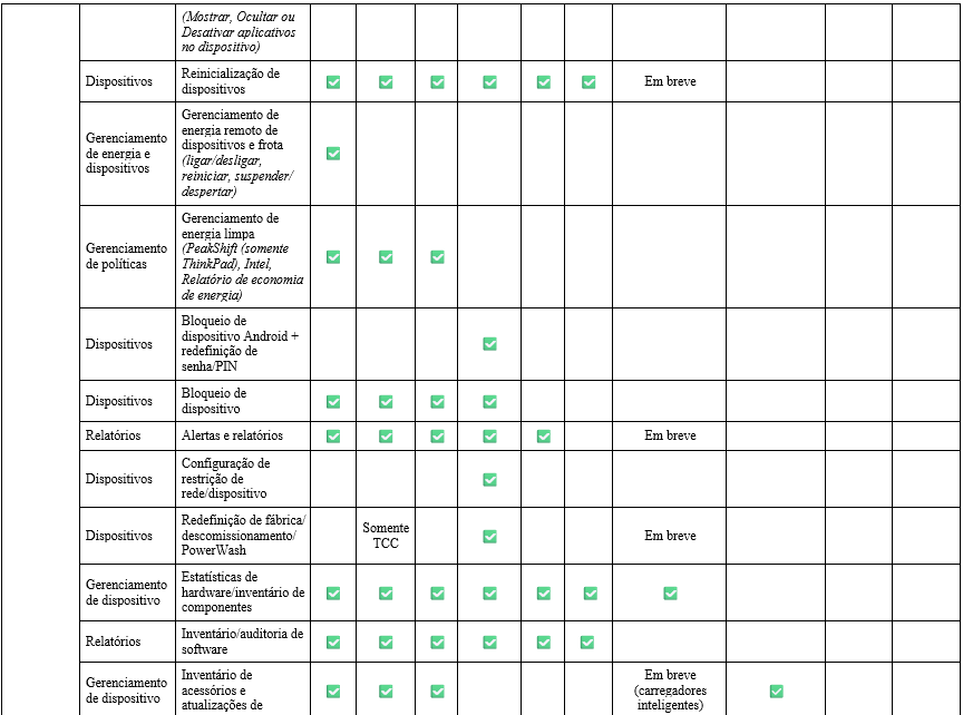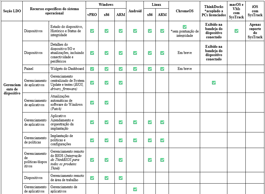 Essa matriz apresenta uma visão geral dos sistemas operacionais e ambientes específicos aceitos pelo Lenovo Device Orchestration (LDO) para seus principais recursos de gerenciamento. A matriz exibe claramente a disponibilidade de funções, como controle remoto de energia, implantação de aplicativos e gerenciamento de BIOS, em plataformas, como Windows, Android, Linux, ChromeOS, macOS e iOS, além de destacar o suporte a hardware especializado, como o ThinkDocks.