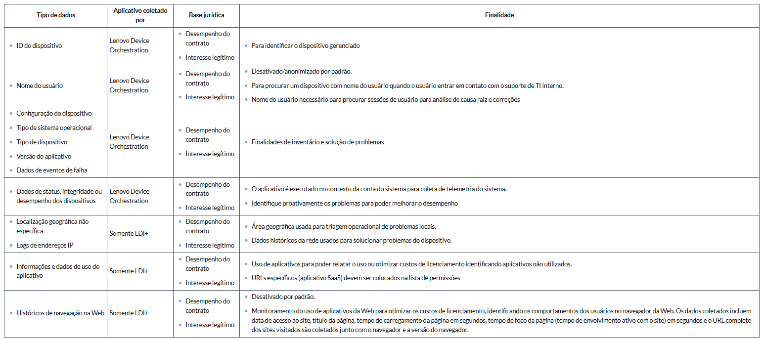 Lembre-se de que dados pessoais correspondem a quaisquer informações relacionadas a uma pessoa física identificada ou identificável. Quando você usa o produto, os dados são coletados pelo cliente do endpoint do Lenovo Device Orchestration e resumidos em seu locatário do cliente dedicado hospedado em um de nossos datacenters da AWS e/ou do Azure. A Lenovo não acessa nem processa esses dados ao prestar serviços de atendimento ao cliente. As categorias de dados podem ser resumidas em: a) Status, integridade ou dados de desempenho dos dispositivos usados ou gerenciados por você; b) Dados de uso do software; c) Dados de local não precisos e d) Inventário de dispositivos. Consulte a tabela a seguir para obter informações mais detalhadas.