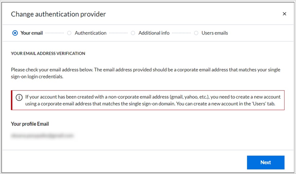 - หลังจากสร้างแอปพลิเคชันใหม่แล้ว ให้รวบรวมข้อมูลที่จำเป็นเพื่ออัปเดตประเภทการตรวจสอบสิทธิ์ขององค์กรเป็น Microsoft Entra ID
